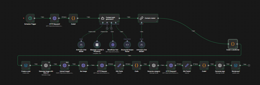WordPress, n8n, Perplexity Sonar Pro, Anthropic Opus 4.5, DALL-E 3, and Custom Code